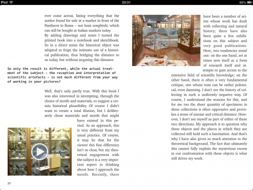 Mit einem Text von Andrea M. Gáldy und Interviews mit Nikola Irmer und Axel Lapp sowie Paolo Agnelli und Nikola Irmer. Darüber hinaus bietet das E-book Bildgalerien, Referenzen, Audio, Filmausschnitte und interaktive Widgets, die eine eindrückliche Erfahrung der Arbeiten von Nikola Irmer ermöglichen.