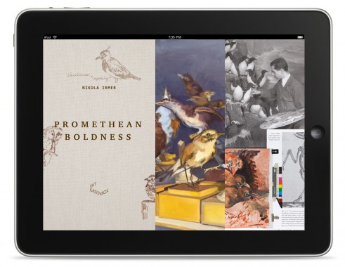 Promethean Boldness von Nikola Irmer dokumentiert zum ersten Mal Irmers Zeichnungen und Bilder aus historischen Sammlungen ornithologischer Präparate. In ihren Arbeiten dokumentiert sie den Zustand der wissenschaftlichen Sammlungen, ihre vormalige Bedeutung und ihren gegenwärtigen Verfall. Sie wird dabei selbst zur Forscherin, die sich über ihre künstlerische Arbeit auch wieder dem in diesen Sammlungen enthaltenen Wissen annähert.