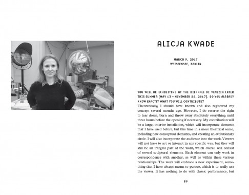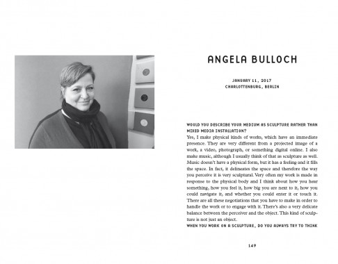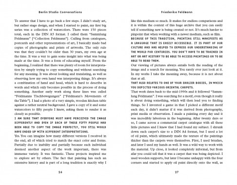 For Berlin Studio Conversations – Twenty Women Talk About Art, art historian Stephanie Buhmann conducted interviews with nineteen female artists. While their genres, aesthetics and media differ greatly, they still have one thing in common: they all live and work in Berlin. In search of the contents, which are outside the medial fixation on the art market, Buhmann visited the artists in their studios and gained insights in the intimate space of their artistic practices. Berlin Studio Conversations presents their unique work processes and approaches, while telling of various philosophies, sources of inspiration and personal histories.